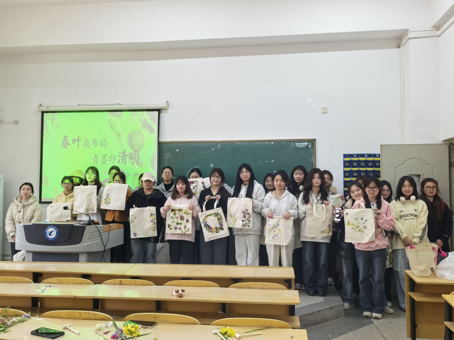 春叶敲布韵,青墨印清明。在教学D楼,参加活动的同学们化身“自然艺术家”,将事先采集的具有药用植物叶片,运用古法草木拓印技艺,将大自然的蓬勃生命力定格成一幅幅充满创意与思念的作品。24医检2班周雅洁同学一边轻敲槌柄,一边感慨道:“原来《本草纲目》里的草药不仅能治病救人,还能化作承载思念的艺术载体。”