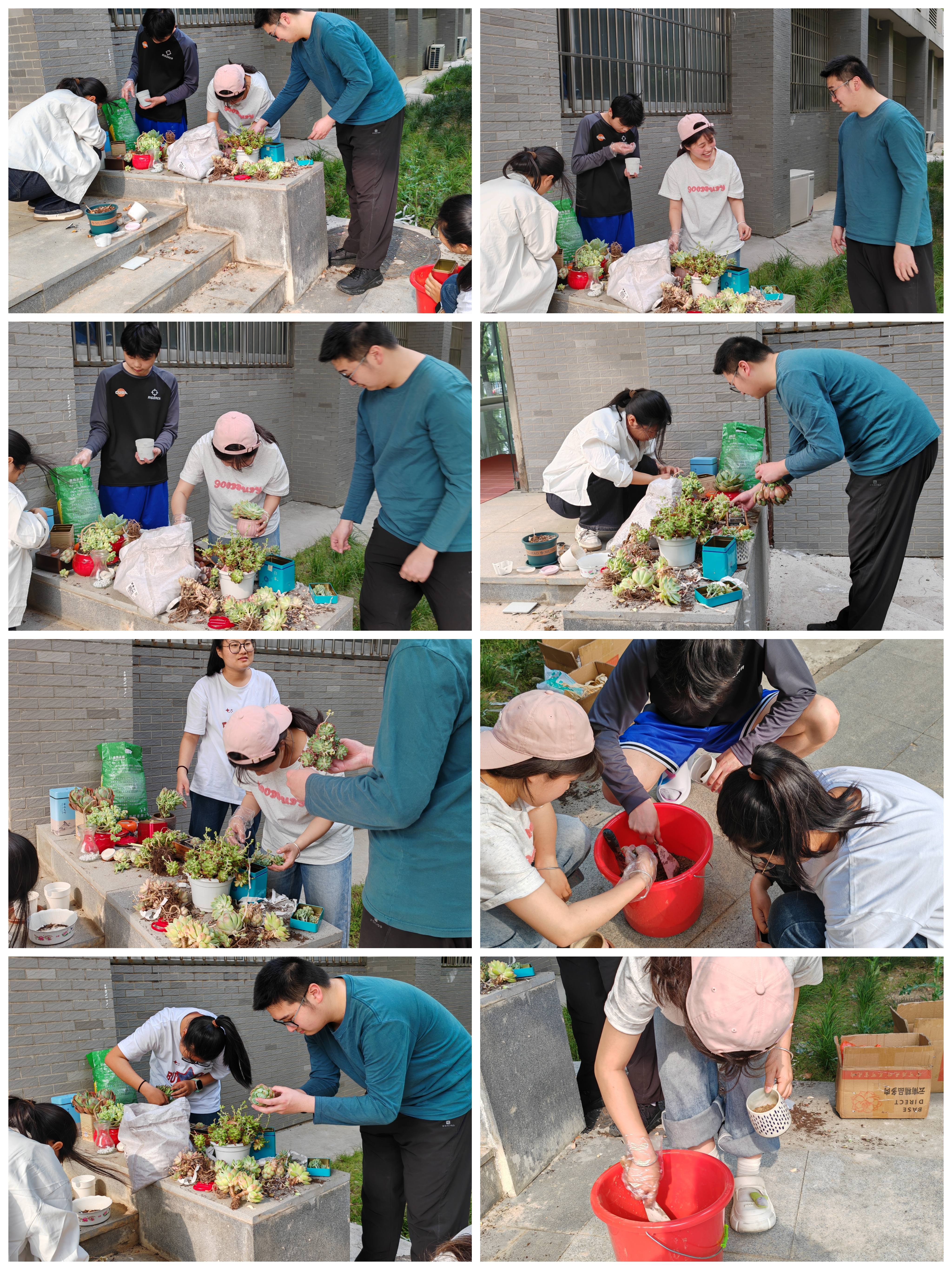 实践环节 大家有序地挑选自己心仪的多肉品种,手中的小铲子、小耙子等工具在他们手中灵活运用。有的同学小心翼翼地将多肉从育苗盆中取出,仔细清理根部的旧土;有的同学精心调配着新的土壤,力求为多肉打造最适宜的生长环境;还有的同学一边填土,一边轻轻压实,确保多肉稳稳扎根。同学们相互交流、相互帮助,分享着种植过程中的小技巧与心得感悟,欢声笑语在校园的每一个角落回荡。