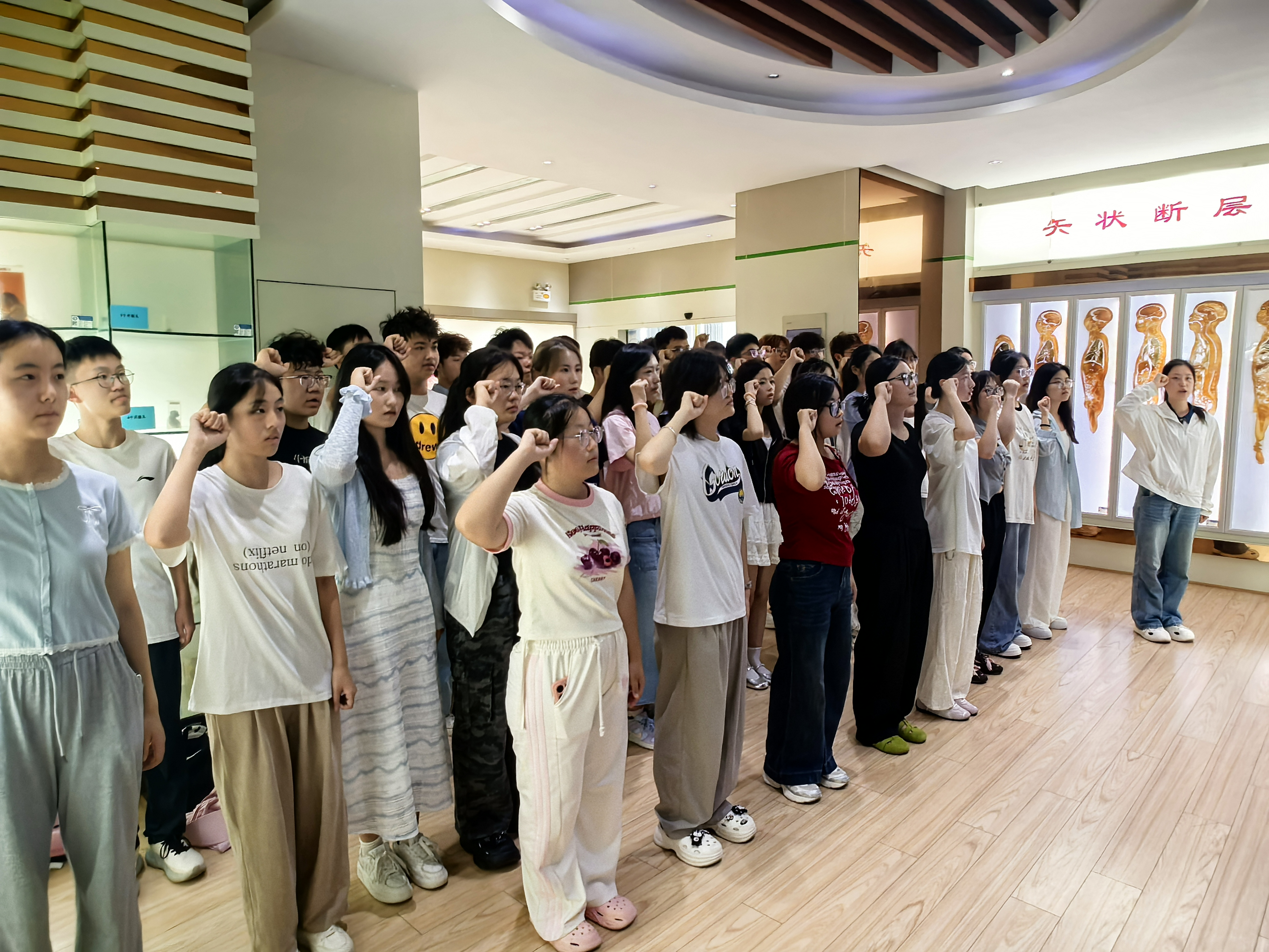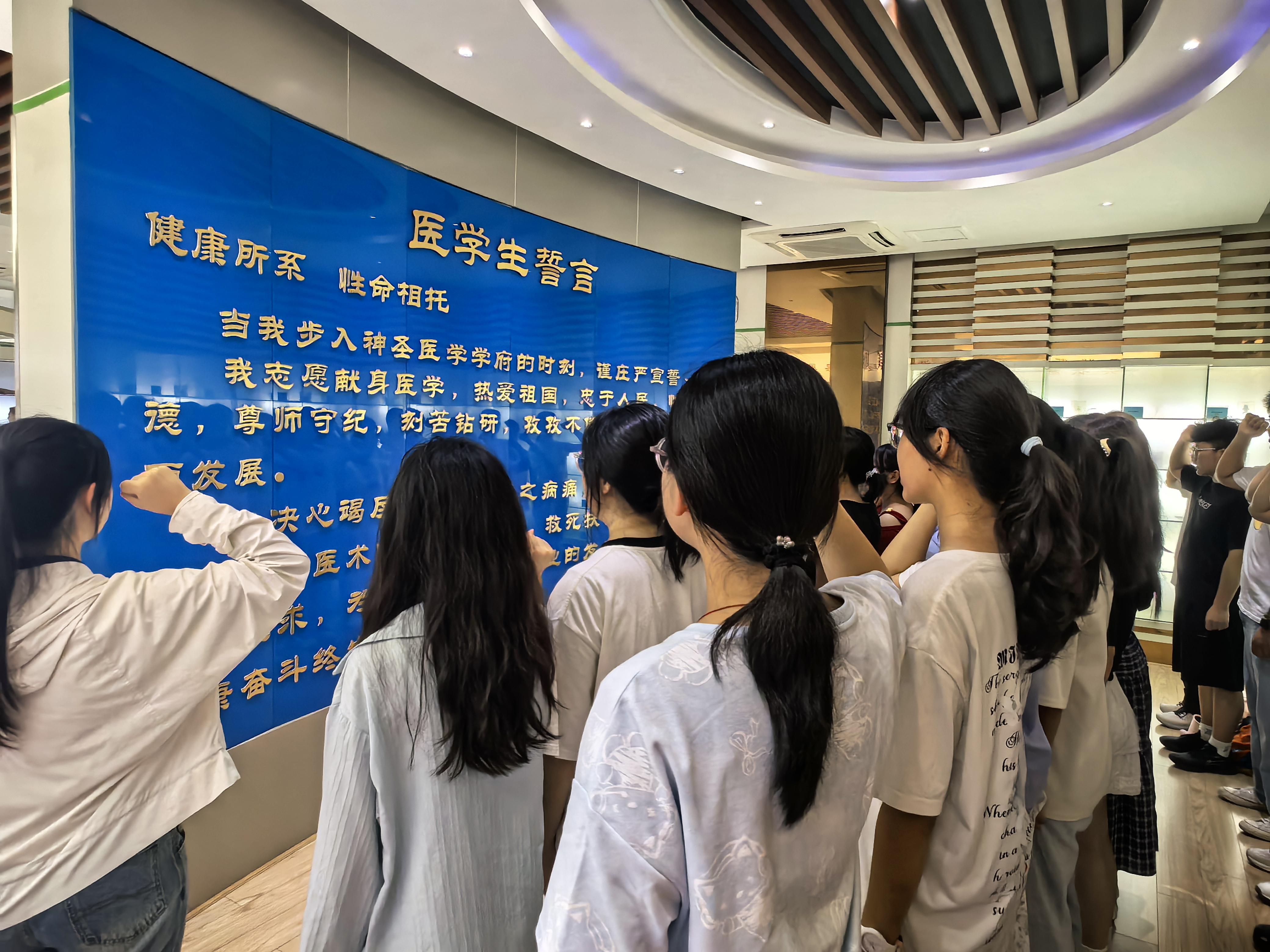 9月12日,430名bw必威西汉姆联官方网站新生在资深教师夏传余的带领下,参观了生命科学馆。夏老师重点讲解了馆内珍藏的“大体标本”和胚胎发育系列展品,引导新生们感悟生命的崇高与医学的责任。在肃穆的氛围中,全体新生在宣誓墙前庄严举起右手,许下了“健康所系,性命相托”的医学誓言,标志着他们医学事业的正式启航。