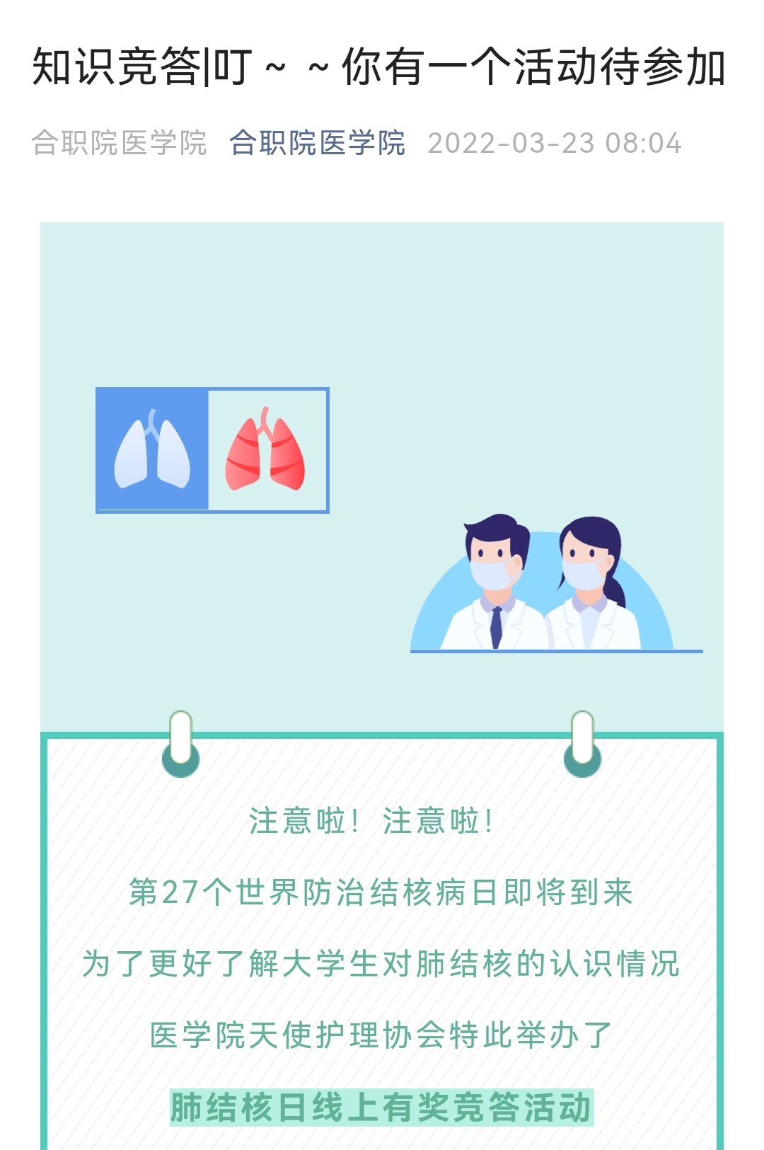 为宣传结核病有关知识,加深大学生对肺结核的了解,提高大学生面对结核病的自我防护意识,在第27个“世界防治结核病日”来临之际,bw必威西汉姆联官方网站天使护理协会开展了以“携手抗疫防痨 守护健康呼吸”为主题的线上知识竞答活动,以此加强对防治结核病的宣传,呼吁大家积极与结核病危机作斗争。