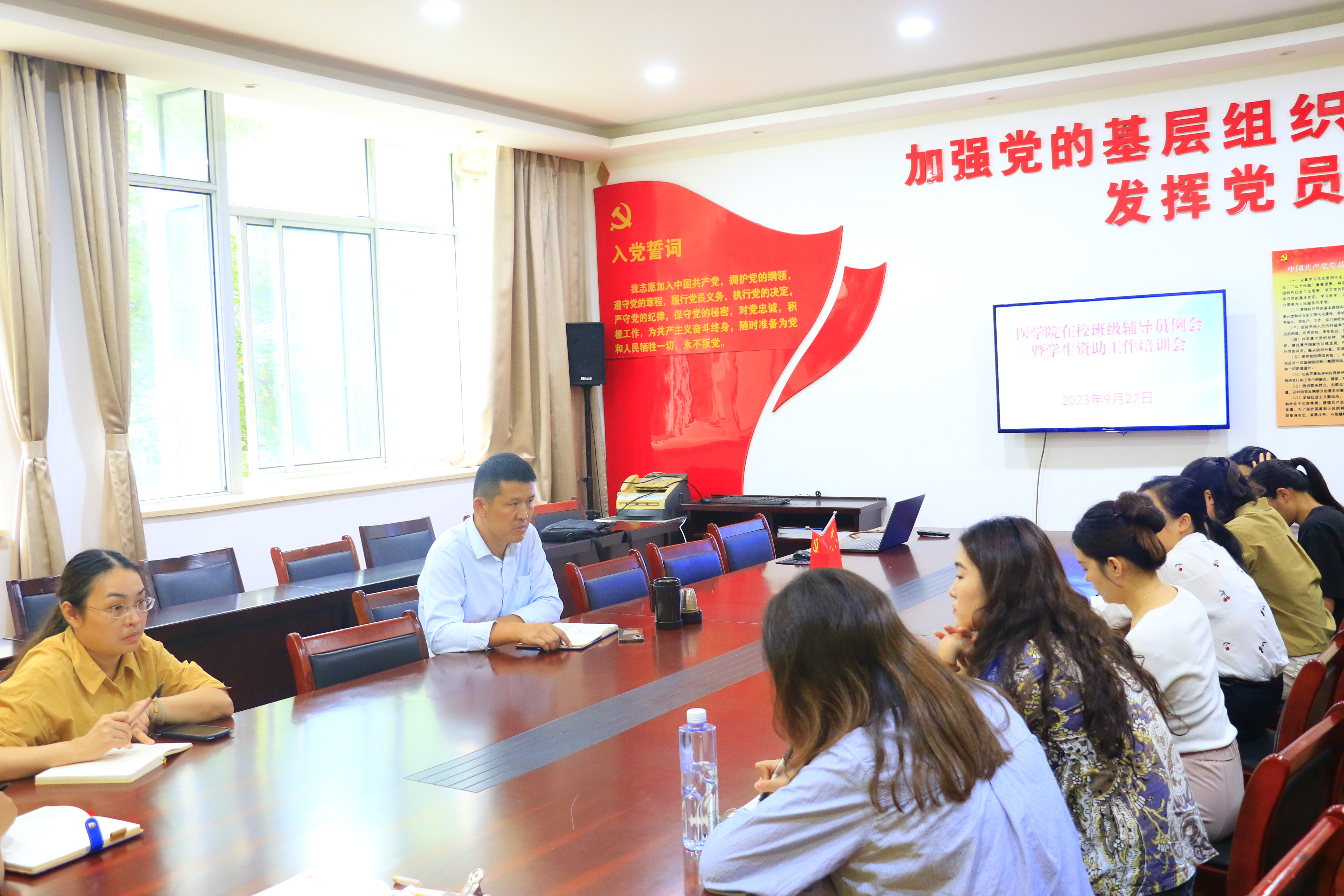 为进一步加强辅导员队伍建设,提升专兼职辅导员工作能力,做好近期学生工作,9月27号下午,bw必威西汉姆联官方网站在医学楼党员活动室召开全体在校班级辅导员例会暨学生资助工作培训会。会议由学工办主任孙亚萍主持,党总支副书记(主持工作)邹华兵、全体专职辅导员和在校班级辅导员参加了此次会议。