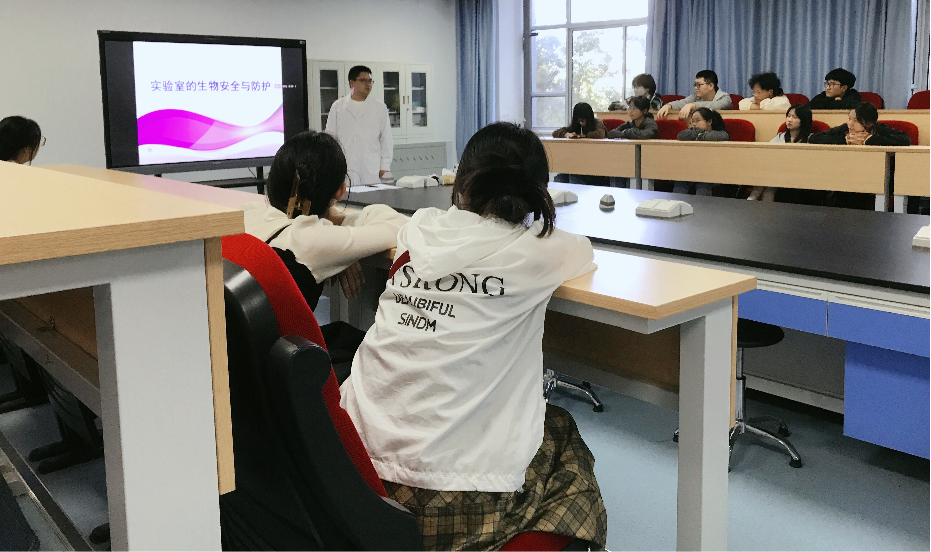 11月1日下午,医学院检验专业大二及大一新生近30人进入实训基地培训学习。首先,医学检验教研室副主任代永沛老师以《实验室的生物安全与防护》为主题开展教育培训,明确实验室安全管理要求,规范学生实验行为。接着,代永沛进一步明确进入实验室后的注意事项及安全检查整改工作的具体要求。