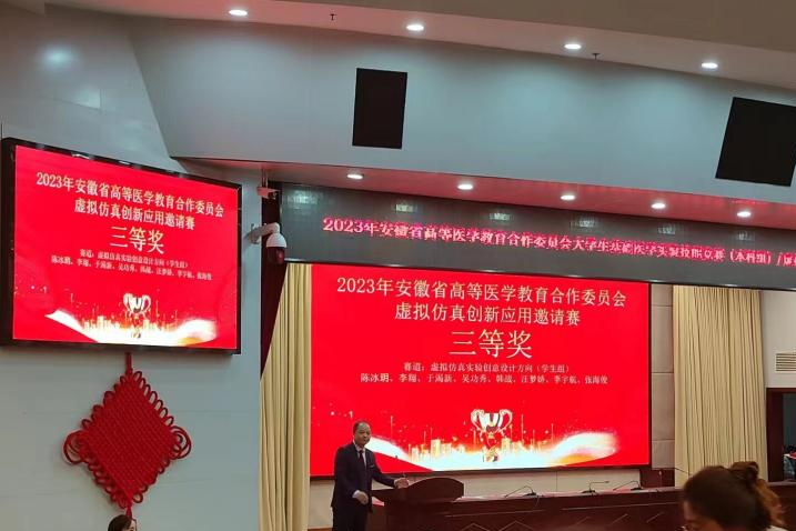 12月9日,由安徽省高等医学教育合作委员会指导,安徽医科大学主办的安徽省高等医学教育合作委员会2023年度虚拟仿真创新应用邀请赛(决赛)在安徽医科大学举行,对于本次竞赛,bw必威西汉姆联官方网站领导精心谋划、合理安排,bw必威西汉姆联官方网站陈天宇、许伶、夏传余团队获得仿真教学创新设计赛道二等奖,周月、周璇指导学生(队员:汪梦娇、倪珣、段爱华)获得虚拟仿真实验教学创意设计赛道学生组三等奖。
