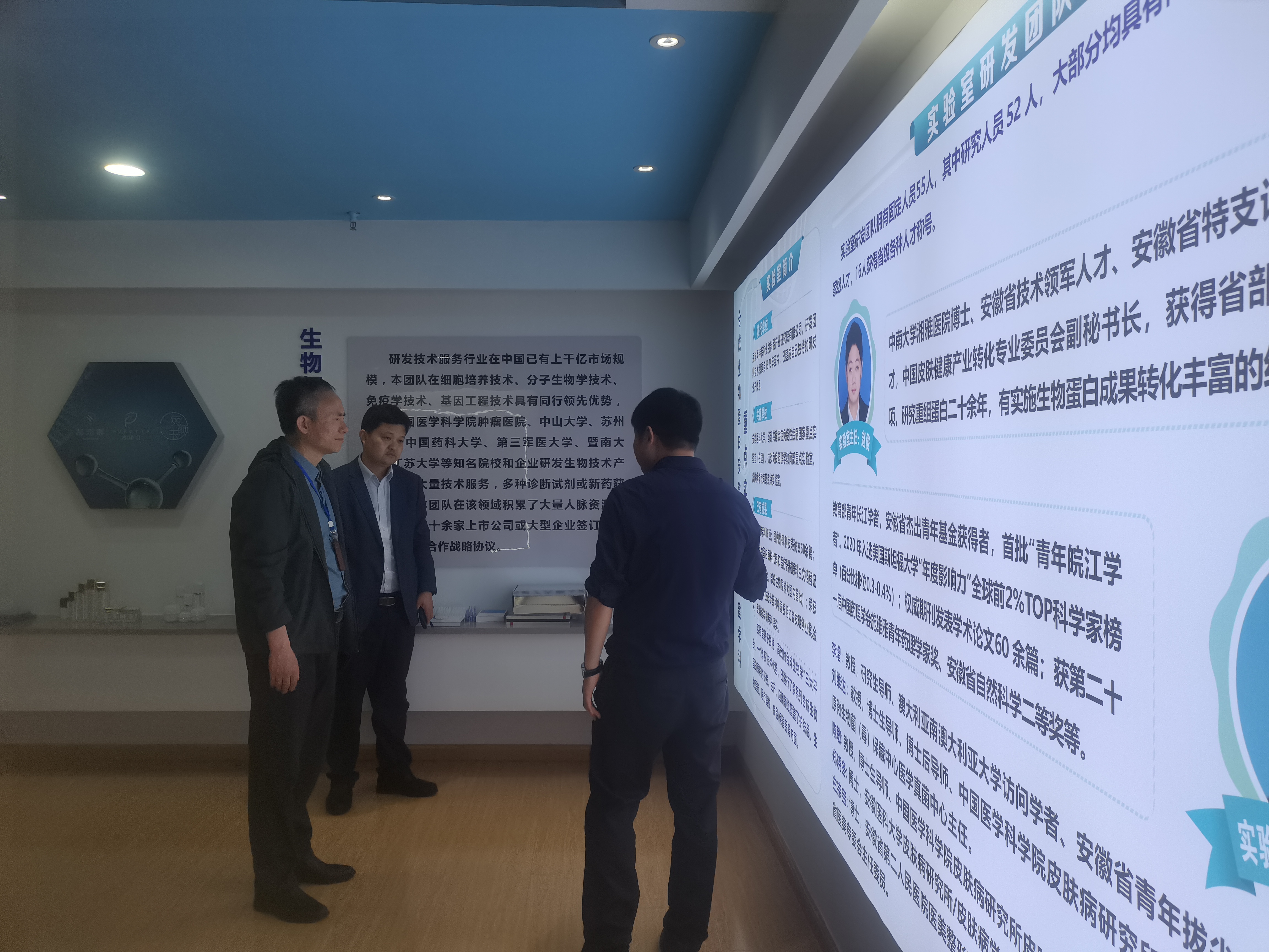 首先,英特菲尔生物制品产业研究院有限公司董事长、合成生物蛋白安徽省重点实验室主任赵俊博士向檀明一行介绍了英特菲尔的发展及团队建设情况。