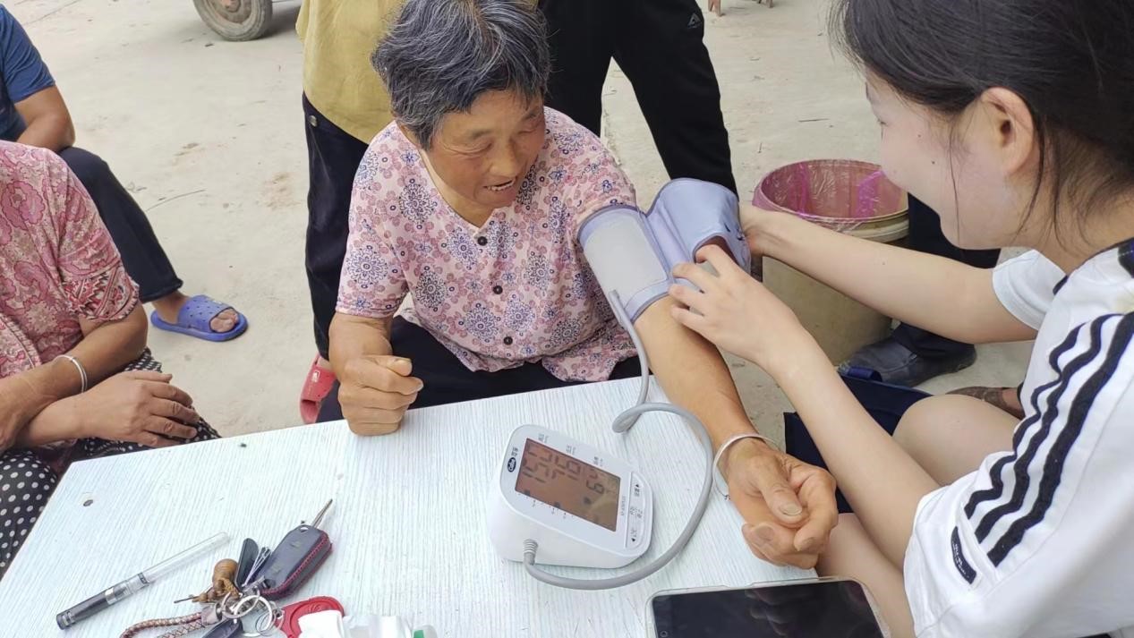 同学们携带专业设备,对太山村的卫生医疗情况进行了深入的走访调查,并为每一户村民都进行了血压和血糖测量。看似简单的测量工作,却让同学们深刻体会到了推进乡村医疗建设的不易。测量过程中,同学们发现患无症状高血压的村民对自身健康重视严重不足,认为无症状就是健康的表现,经过师生的反复宣传,才终于意识到自己的身体状况;也有村民反映日常用药后高血压得不到很好的控制或副作用较大,同学们都根据他们所说的情况,针对性检查药物,提出相应的换药和配合治疗的建议方案。为了保证血糖测量的精准度,团队同学们在检查的前一天晚上逐个打电话告知村民次日空腹测量的相关事宜。测量结果出来后,同学们贴心的为需要治疗的村民写好小便签,便于村民前往卫生院进行进一步检查和购买药物。