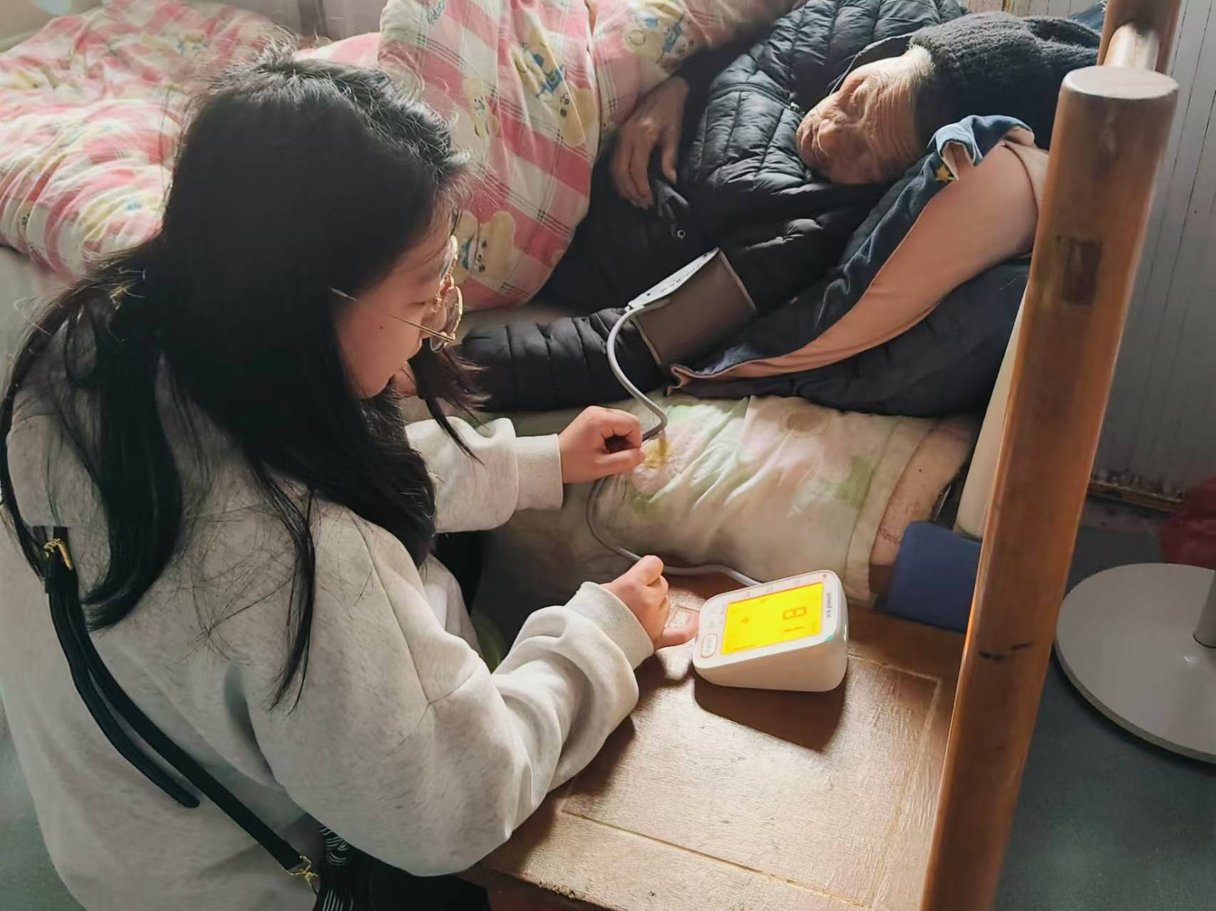 志愿者们首先开展健康监测服务。他们为全院老人测量并记录血压,并根据测量的血压情况,同步开展老年常见病预防、合理用药等健康宣教,帮助老人掌握自我健康管理技能。