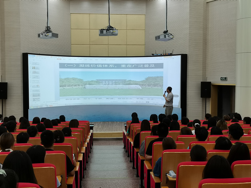 该讲座分为三部分:社会主义核心价值观提出的时代背景、社会主义核心价值观科学内涵、社会主义核心价值观培育和践行的路径。讲座由铿锵激昂的《走向复兴》:“我们迎着初升的太阳,走在崭新的道路上;我们是优秀的中华儿女,谱写时代的新篇章……”视频导入,这种热情洋溢的爱国主义情绪贯穿讲座始终。