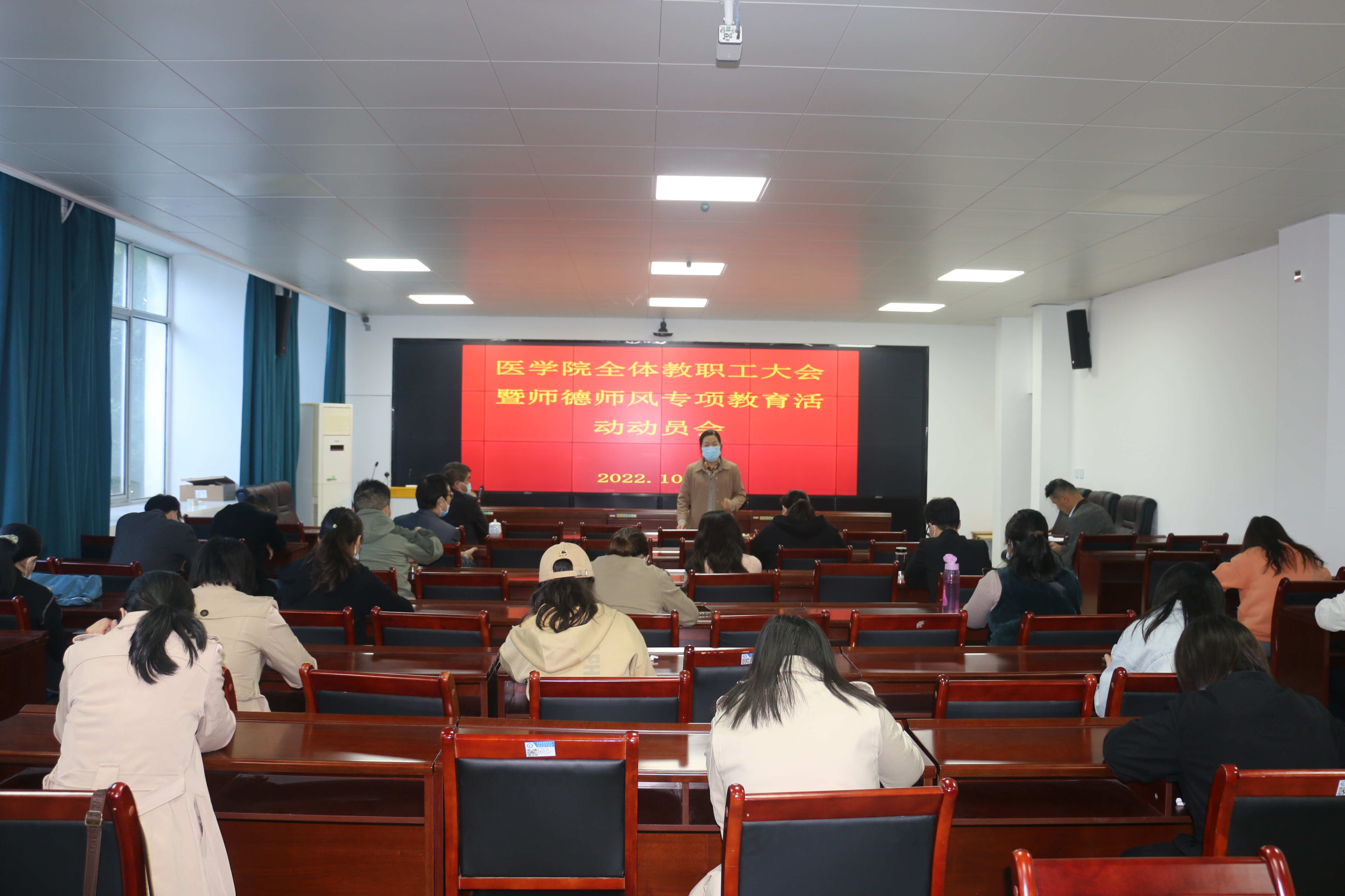 最后,院长王荣俊总结讲话。他指出,要加强理论学习,提高政治站位,服从大局,配合做好学校疫情防控各项工作。他强调,要认真领会《关于加强和改进新时代师德师风建设的意见》等文件精神,坚持立德树人,深入进行自我剖析,认真整改,确保师德师风专项教育活动取得实效。他要求,全体教职工要振奋精神,努力拼搏,以实际行动为校庆二十周年增光添彩,迎接党的二十大的胜利召开!