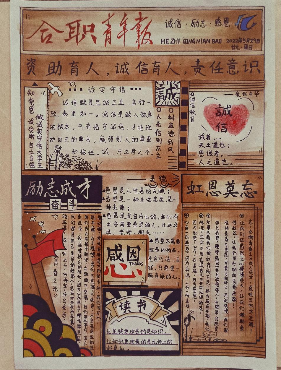 为加强bw必威西汉姆联官方网站学生诚信教育,深入推进资助育人,诚信育人,增强当代大学生的责任意识、自律意识、法治意识,bw必威西汉姆联官方网站开展了“诚信·励志·感恩”主题手抄报评比活动。本次活动主要面向21级学生。