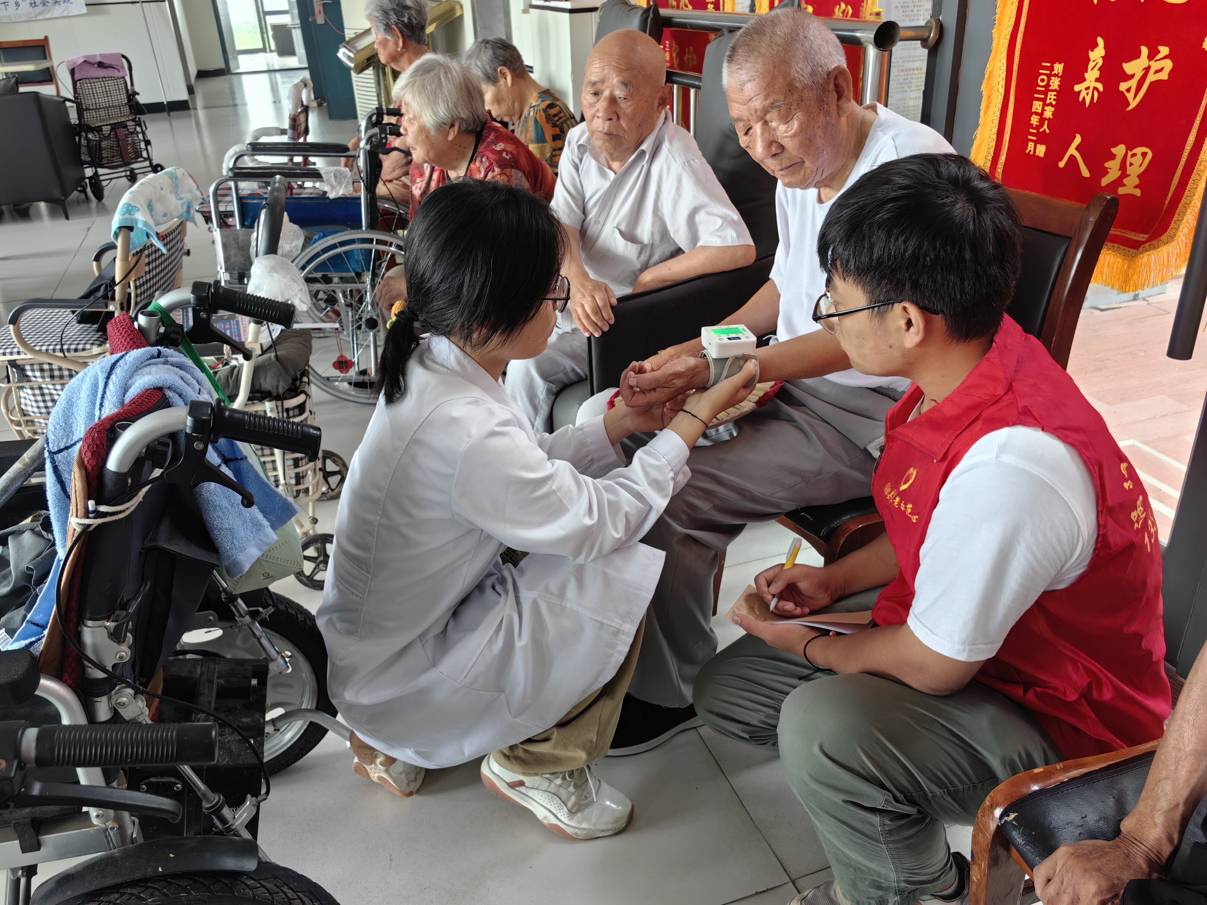 紧接着,合心筑梦团队的同学们来到了涡阳县养老示范中心,开展了一系列丰富多彩的义诊与健康宣教活动。一踏入养老示范中心,团队成员们便迅速投入到了紧张而有序的工作中。他们不仅为老人们进行了全面的健康评估,包括血压、血糖等项目的检测,还针对每位老人的健康状况,提供了个性化的饮食建议和生活方式指导。此外,团队成员为表达对老人们的关怀,还向老人们赠送了牛奶、水果等食物。在这几天的实践中,团队累计为83名老人提供了健康服务。他们不仅耐心解答了老人们的各种健康疑问,还通过轻松愉快的互动环节,如健康知识问答、医学科普等活动,极大地调动了老人们的参与热情,使得健康宣教活动既实用又富有趣味性。