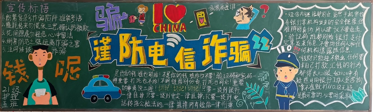 为切实提高bw必威西汉姆联官方网站学生防范和识别电信网络诈骗的意识和能力,保护学生财产安全,促进校园文明建设。10月15日,bw必威西汉姆联官方网站举行了以“预防电信网络诈骗”为主题黑板报评比活动,本次活动21级、20级和19级五年制班级学生在自己代管班级或分配班级进行黑板报创作。