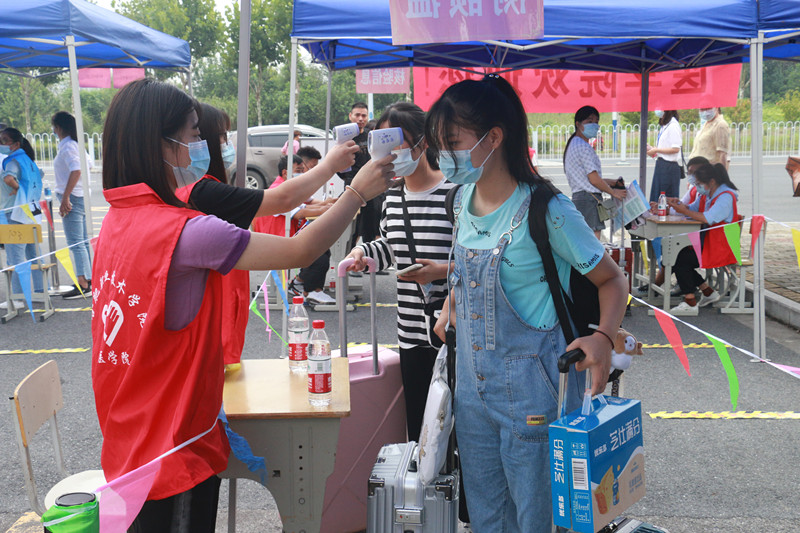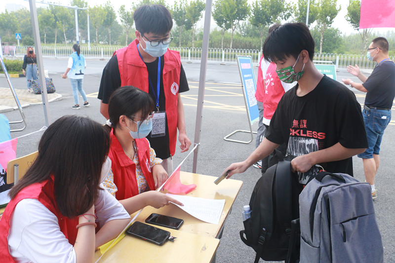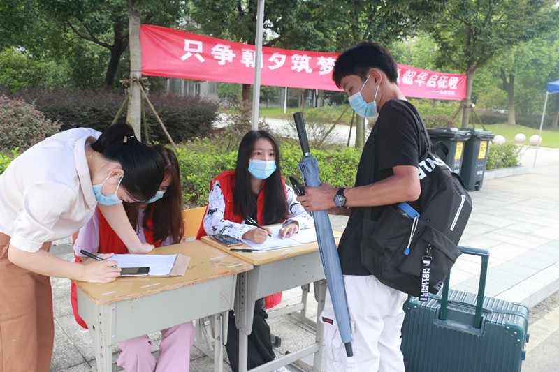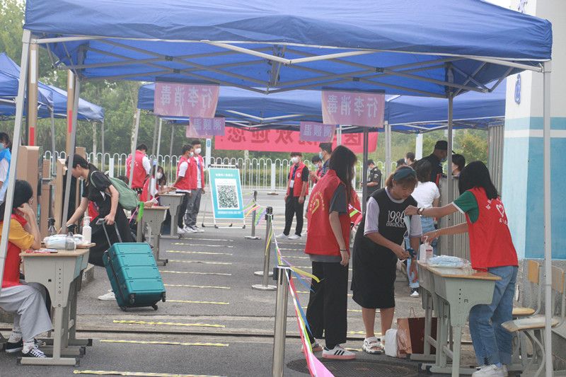 早上七点,各工作组人员已经全部到位,严格按照学校疫情防控相关要求,用扎实细致热情的工作做好学生安全返校工作。学生们按照计划时间到达校门口,在一米线间隔排队、先后进行安康码核查是否绿码、疫苗接种与否、14天行程有无异常、核酸检测报告是否阴性等信息核验、测额温、行李与手消毒、更换口罩、信息登记等多个环节,报到现场井然有序。