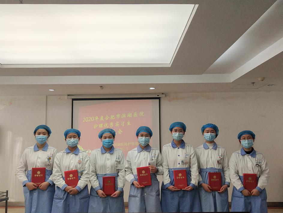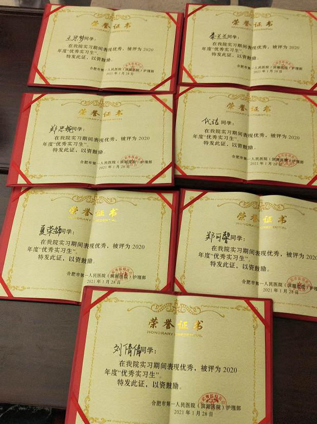 2021年1月28日下午,合肥市第一人民医院召开优秀实习生表彰大会。我院护理专业秦兰兰、代洁、刘倩倩、王思梦、夏荣锦、郑可馨,助产专业郑思婉等七位同学在实习期间表现优秀,喜获“优秀实习生”称号;护理专业秦兰兰、张慧敏、陶彦余三位同学还被评为“爱心义工”号。