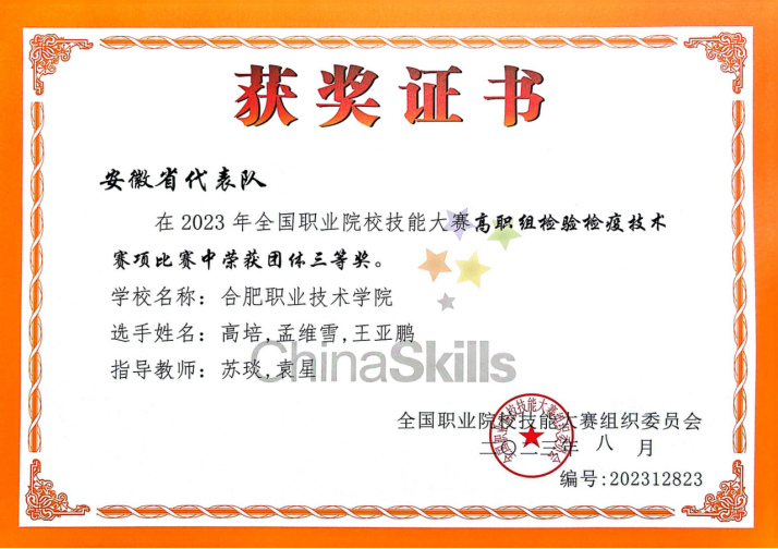 85日,由教育部、科技部、工信部等35个单位主办,山东省教育厅、临沂市人民政府和山东省卫生健康委员会承办,山东医学高等专科学校协办的2023年全国职业院校技能大赛高职组检验检疫技术赛项在山东医学高等专科学校开赛。全国28个省、自治区、直辖市的53支代表队的近200名教师和159名参赛选手参加本次比赛。我校bw必威西汉姆联官方网站医检专业高培、孟维雪和王亚鹏三位同学荣获团体三等奖。